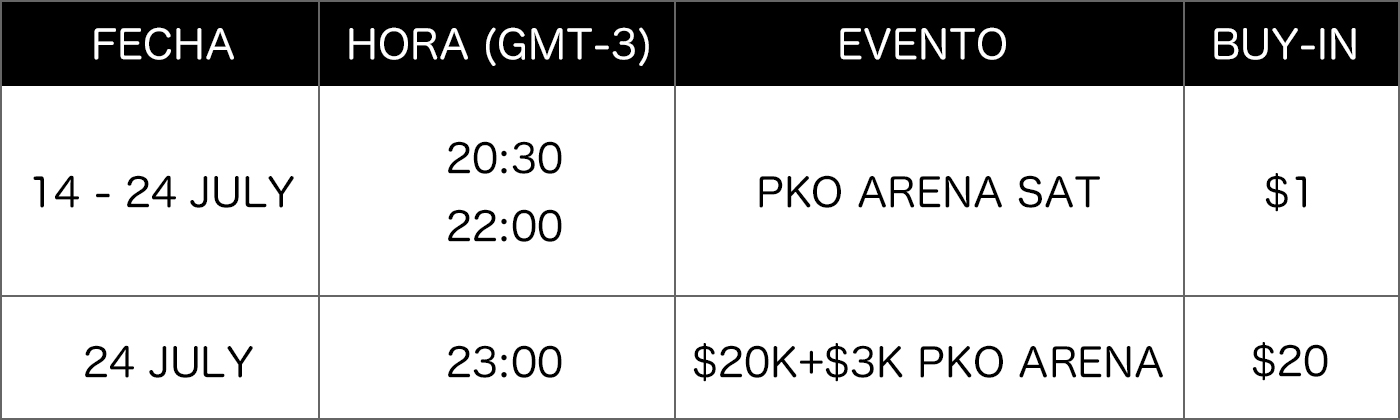 El $20K+$3K ARENA PKO se llevará a cabo el 24 de Julio a las 23:00 (GMT-3) con una entrada de $20 y contará con streamers especiales de poker de todo el mundo, cada uno con un premio BOUNTY de $100.