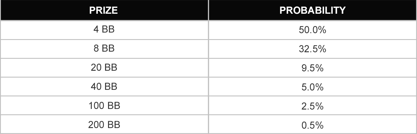 After matching a Blitz board line, players will be awarded a random cash prize via the spinning wheel ranging from 2 BB up to a massive 200 BB Jackpot (4 player tables only).