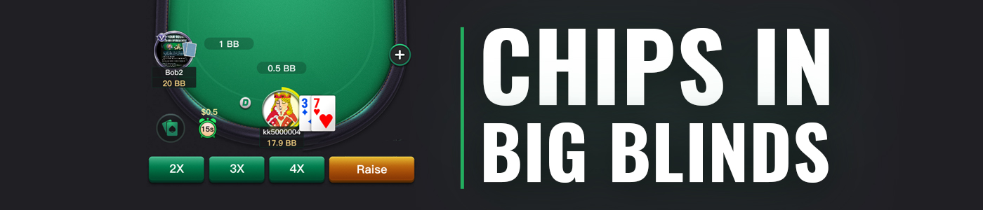 For example, if your chip stack is valued at 100,000 and the current Big Blind is 1,000, your stack will be displayed as 100 BB.