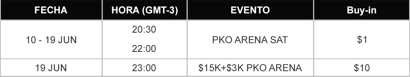 El $15K+$3K ARENA PKO se llevará a cabo el 19 de junio a las 23:00 (GMT-3) con una entrada de $10 y contará con streamers especiales de poker de todo el mundo, cada uno con un premio BOUNTY de $100.