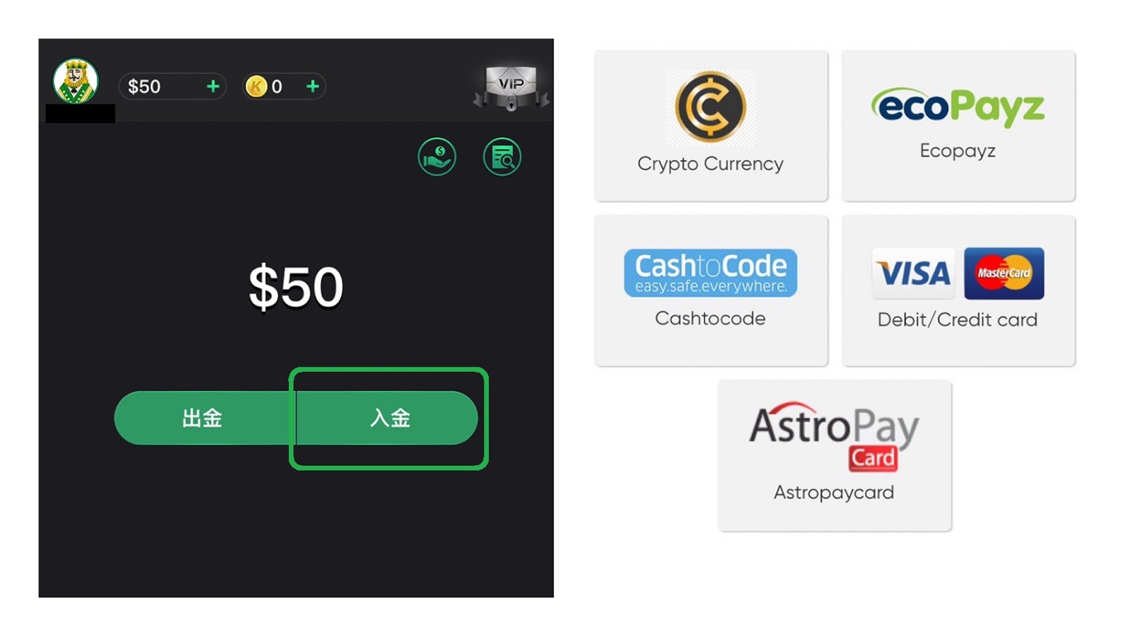 Cryto Currency、ecoPayz、CashtoCode、AstroPay、デビット/クレジットカードがご使用可能です。