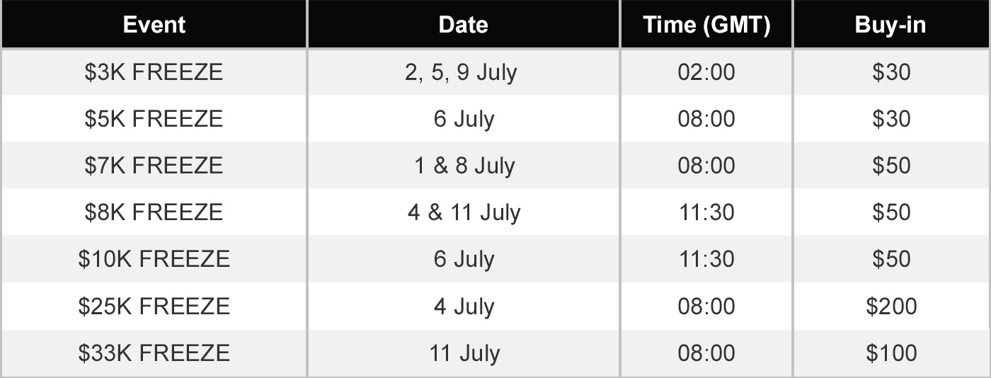 KKPoker offers fantastic value freezeout poker tournaments and across July 1-11 will host over 10 FREEZE events, including back-to-back Sunday big guaranteed prize pools totalling $58,000!